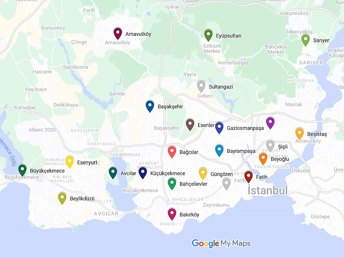 İstanbul’da Adalar, Arnavutköy, Ataşehir, Avcılar, Bağcılar, Bahçelievler, Bakırköy, Başakşehir, Bayrampaşa, Beşiktaş, Beykoz, Beylikdüzü, Beyoğlu, Büyükçekmece, Çatalca, Çekmeköy, Esenler, Esenyurt, Eyüpsultan, Fatih, Gaziosmanpaşa, Güngören, Kadıköy, Kâğıthane, Kartal, Küçükçekmece, Maltepe, Pendik, Sancaktepe, Sarıyer, Şile, Silivri, Şişli, Sultanbeyli, Sultangazi, Tuzla, Ümraniye, Üsküdar, Zeytinburnu ilçelerine ve tüm semtlere hizmetlerimizi ulaştırıyoruz.